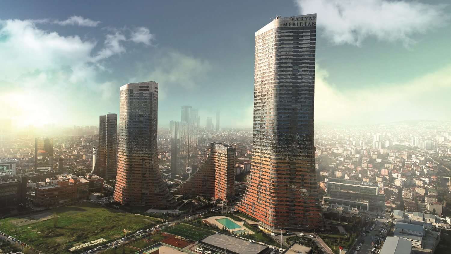 Within Varyap Meridian project being constructed at West Ataşehir, there are total 1500 houses in 5 towers with 20 to 60 storeys, a business center with an area of 50 thousands m², 20.000 m² office building, a 5 star hotel which will be make runned by an international brand and trade areas. There are quite different house choices within the project, from 40 m² studios to special design penthouse apartments.