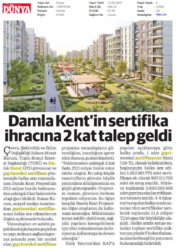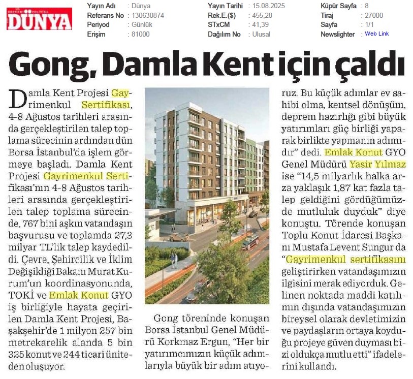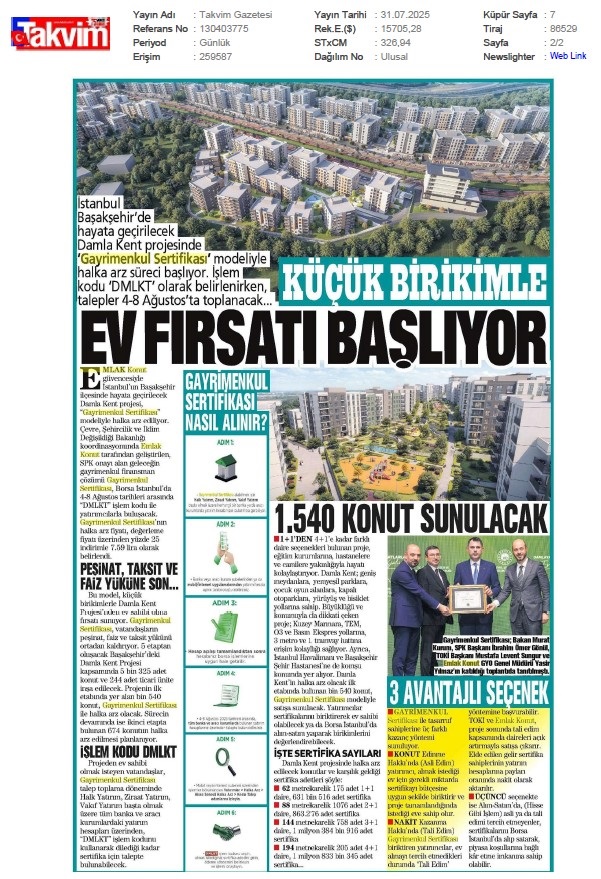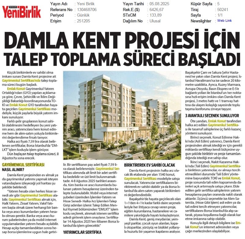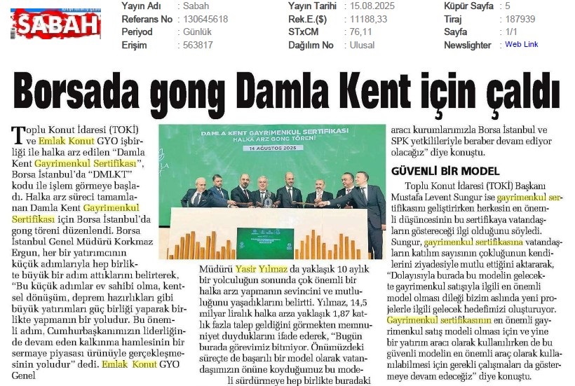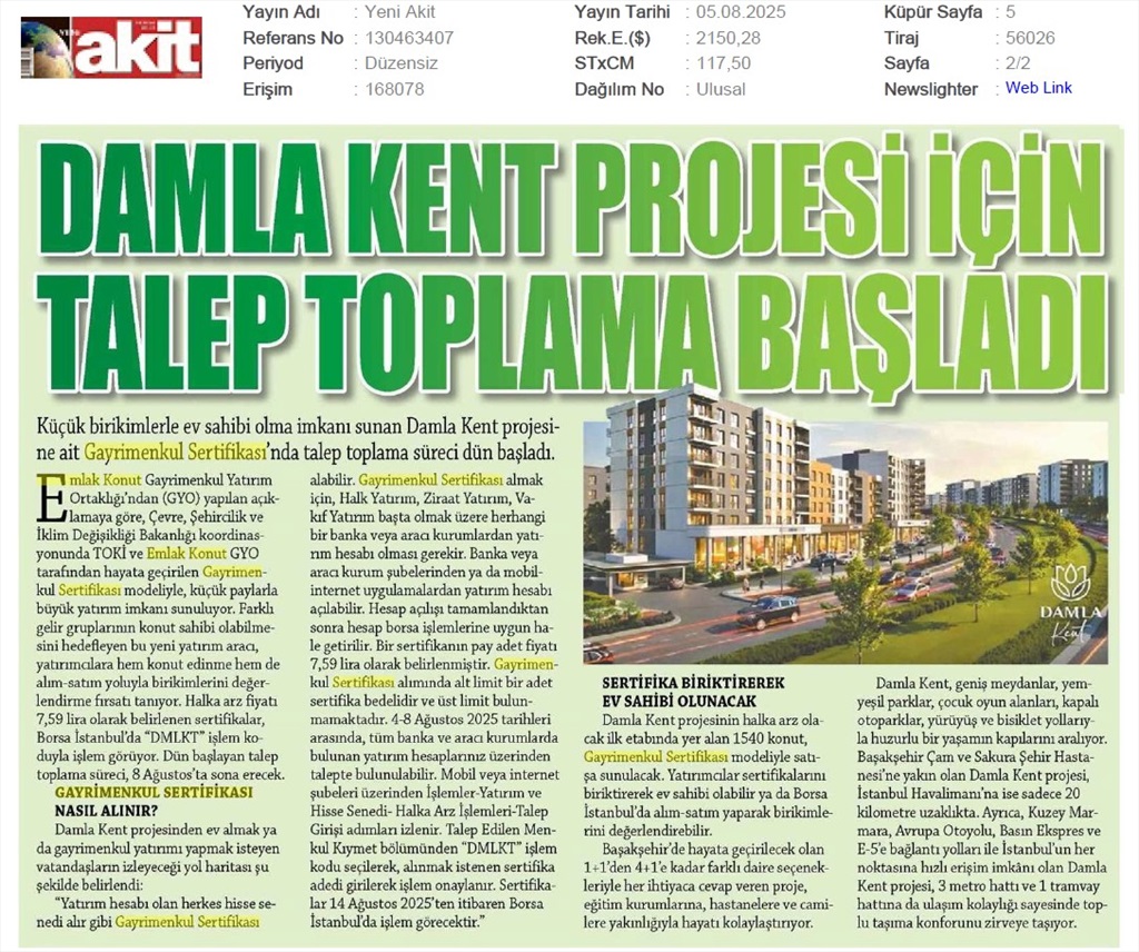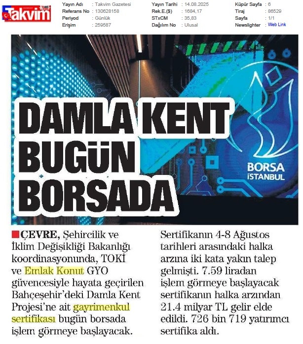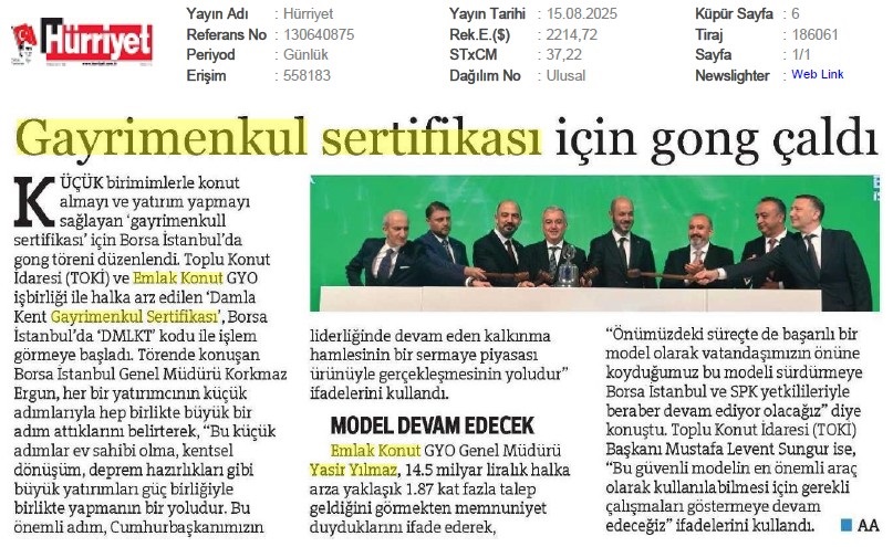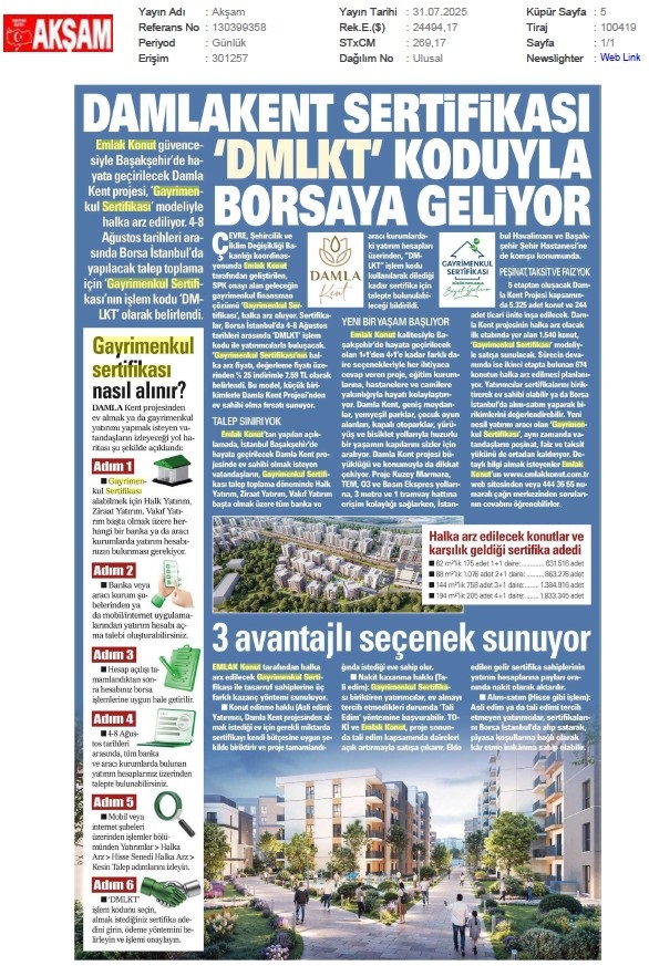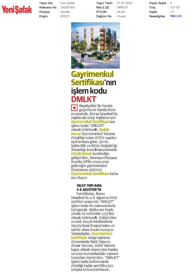 Damlakent Sertifikası 'DMLKT' Koduyla Borsaya Geliyor