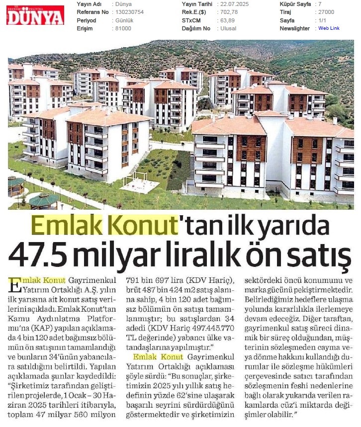 Emlak Konut'tan İlk Yarıda 47,5 Milyar Liralık Ön Satış