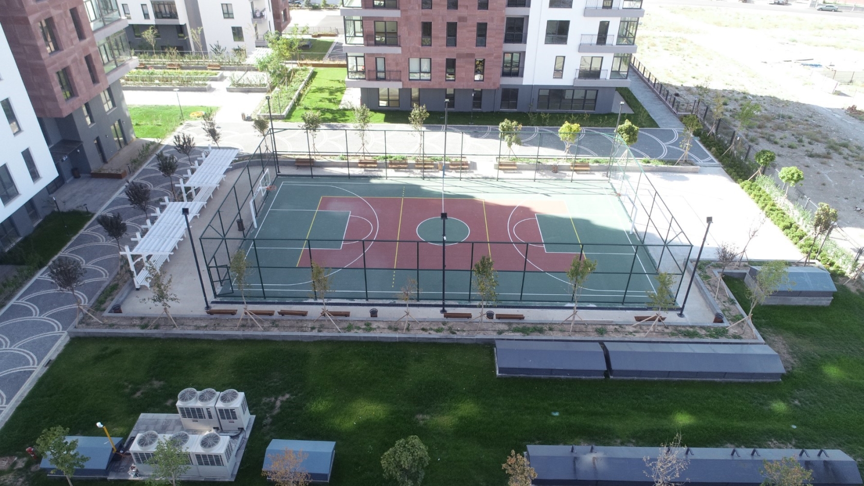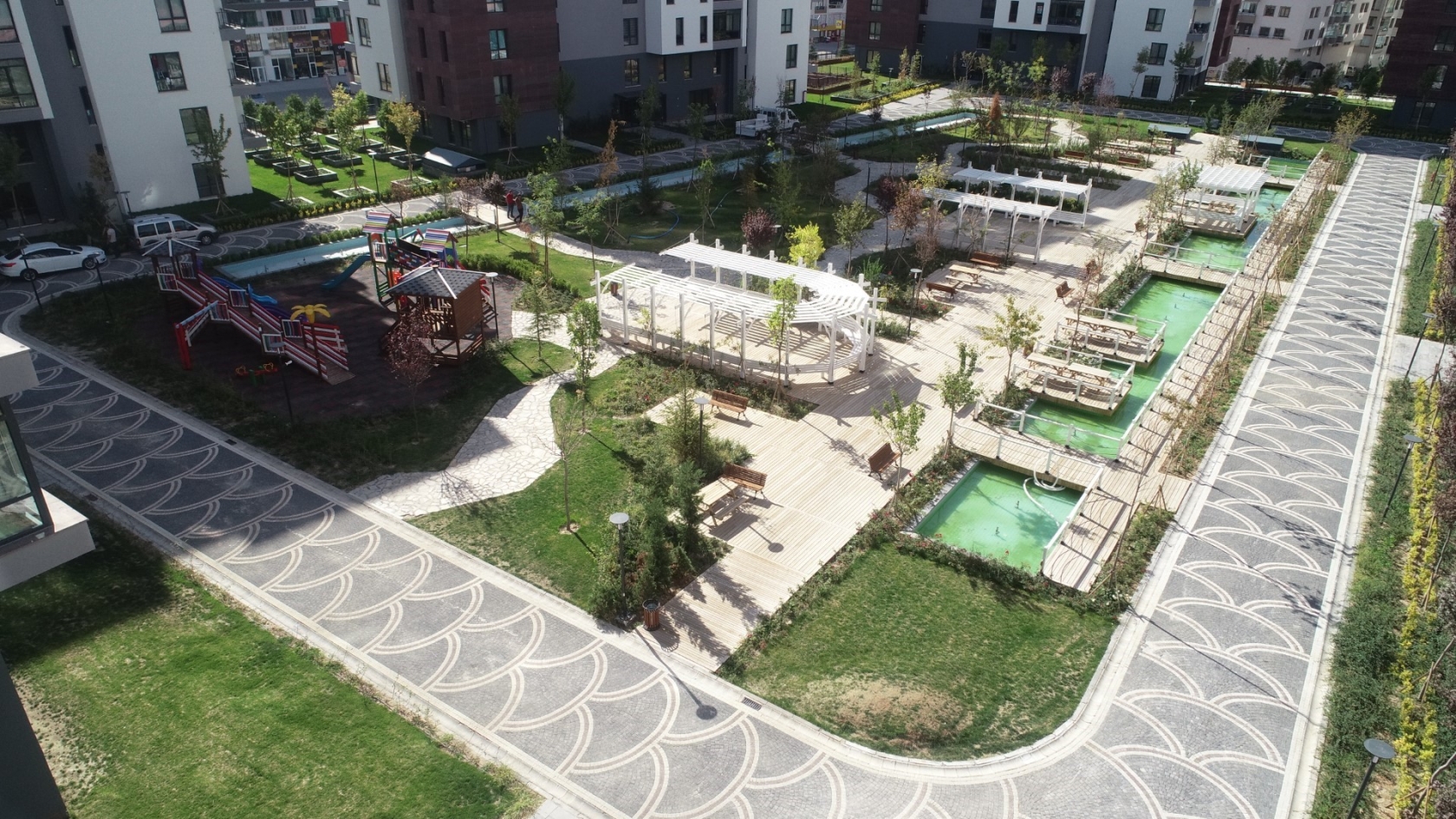 İç peyzaj alanı iki aynı kotta tasarlanarak geniş ve düz yeşil alanlar oluşturuldu.