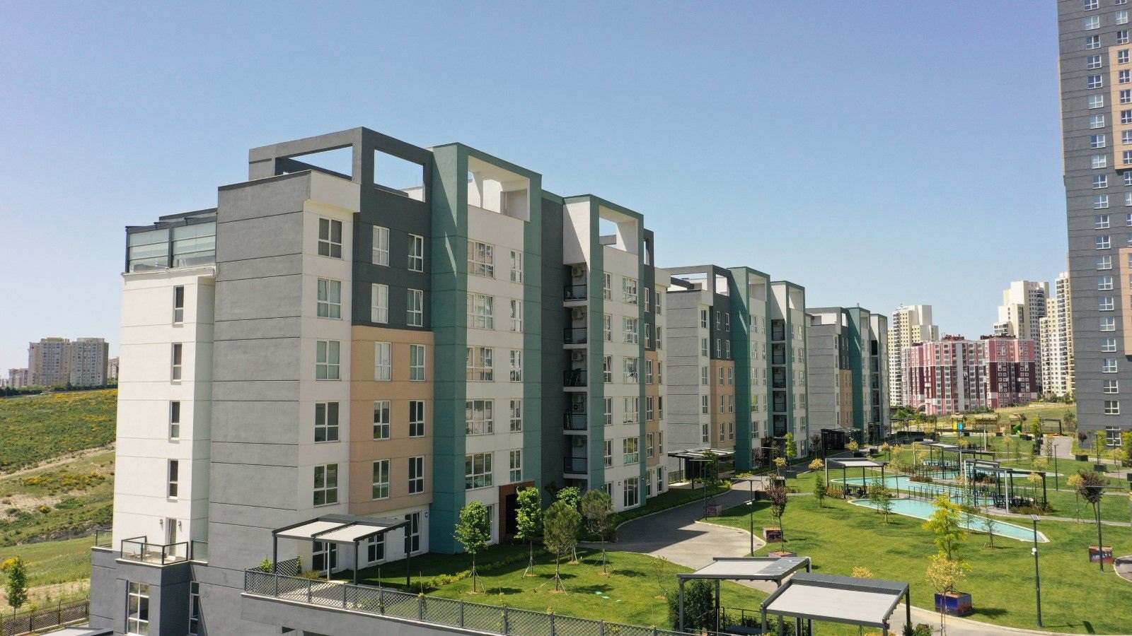 The project includes 26.898 m2 area spared for landscaping; as well as closed swimming pools, hobby rooms, marbling lessons, fitness, Turkish bath, Finnish steam bath and steam bath.
