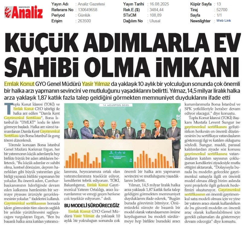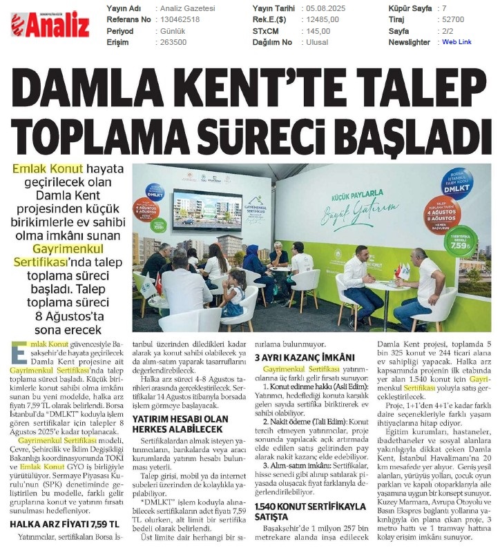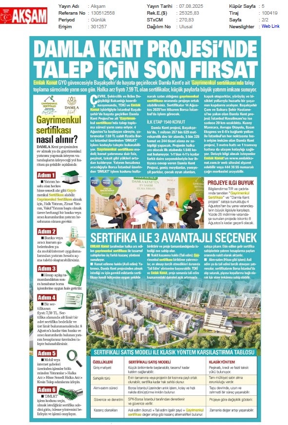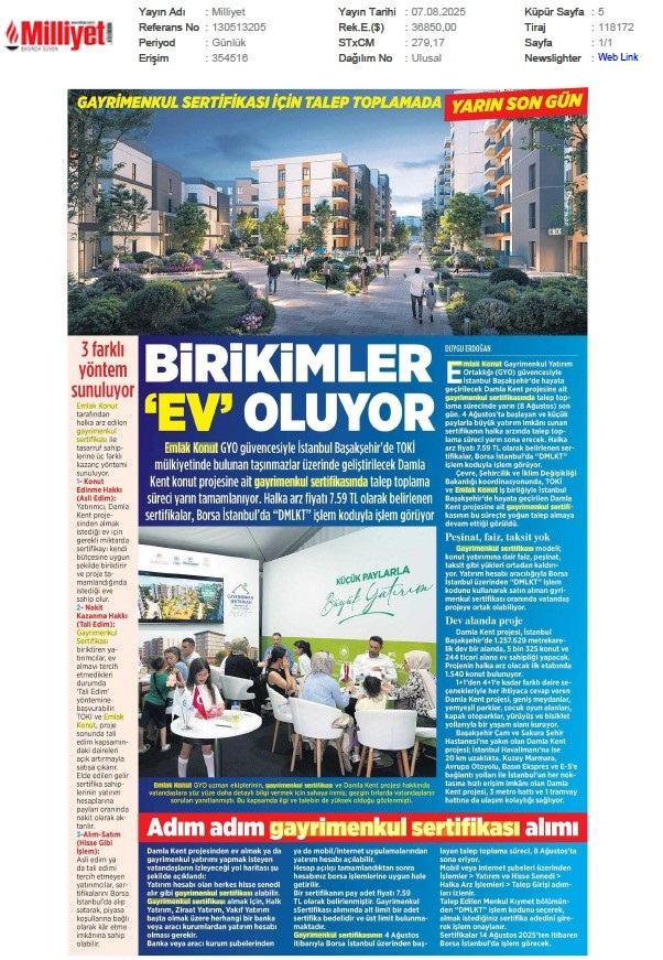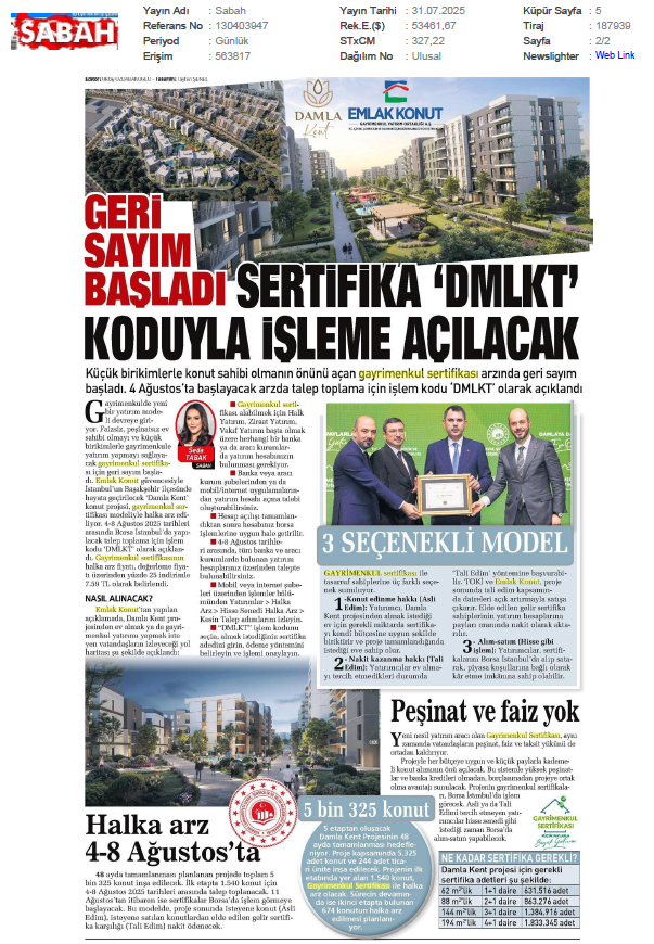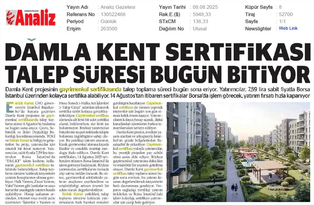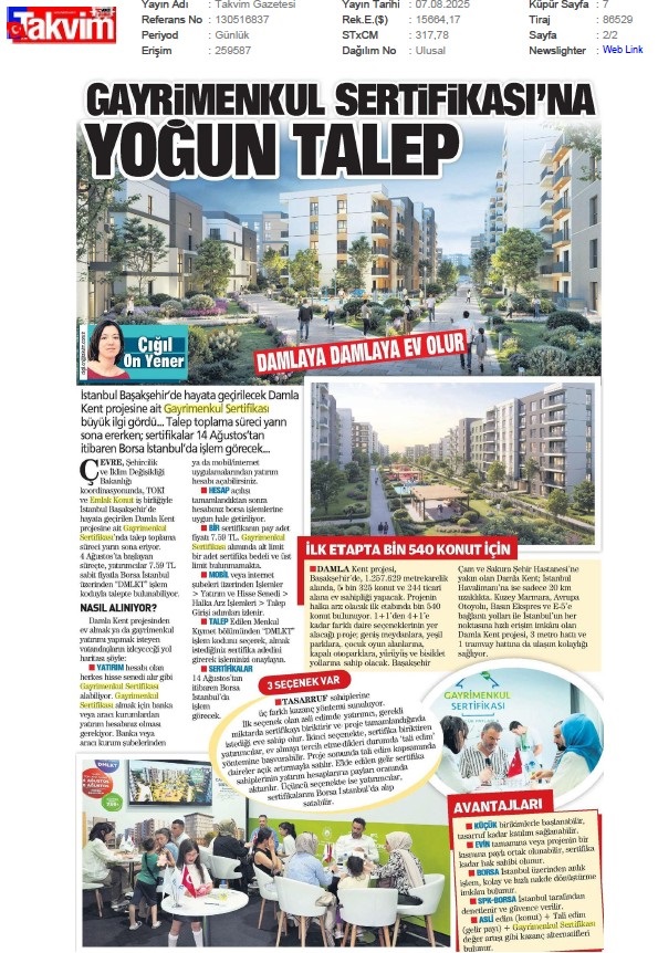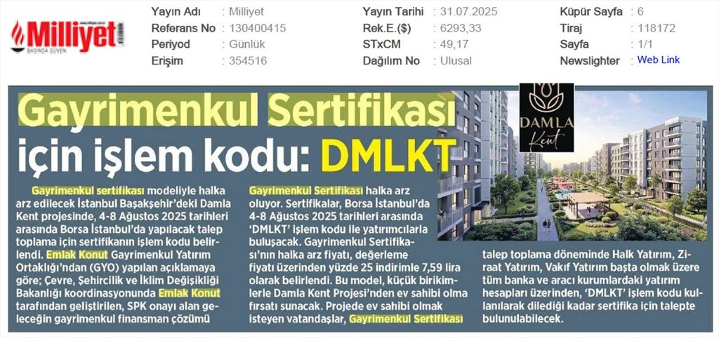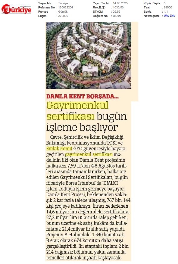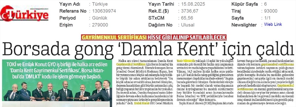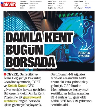 Damlakent Sertifikası 'DMLKT' Koduyla Borsaya Geliyor