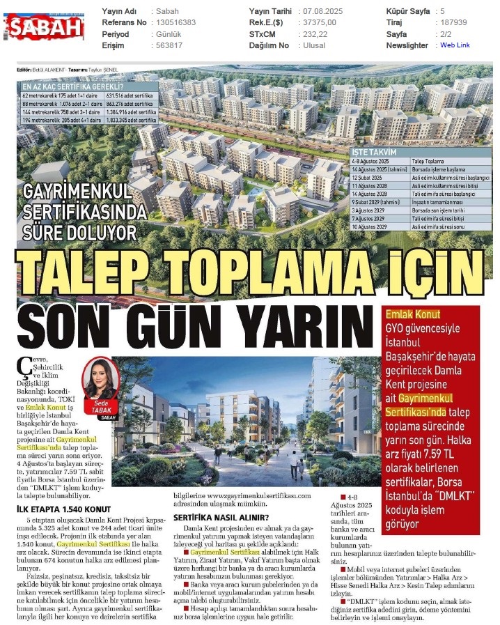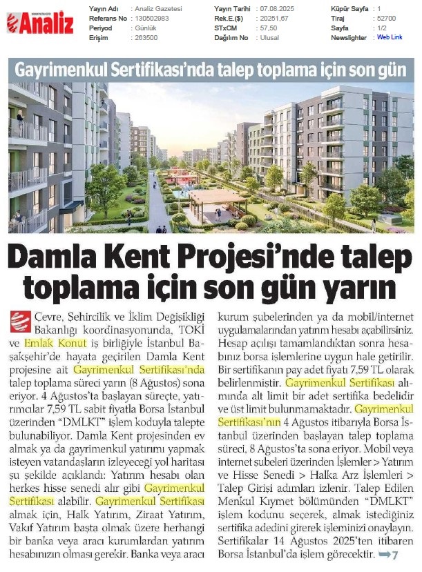 Gayrimenkul Sertifikasında Talep Toplama İçin Son Gün