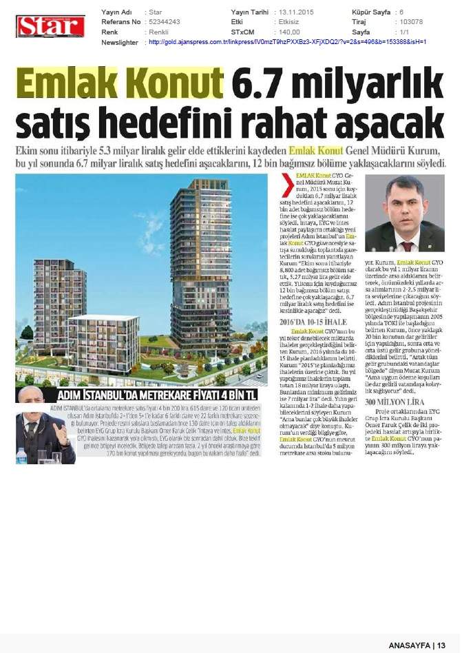 Emlak Konut 2015'te 6,7 milyar lira ciro hedefliyor