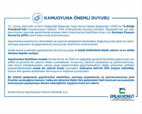 https://www.emlakkonut.com.tr/ alan adlı internet sitesi (“Web Sitesi”), “Barbaros Mah. Mor Sümbül Sok. No:7/2 B (Batı Ataşehir) Ataşehir - İstanbul” adresinde bulunan “Emlak Konut Gayrimenkul Yatırım Ortaklığı A.Ş.” (Bundan böyle kısaca “Şirket” veya “Emlak Konut” olarak anılacaktır.) veri sorumlusu sıfatıyla, kişisel verilerin işleme amaçlarının ve vasıtalarının belirlenmesinden, veri kayıt sisteminin kurulmasından ve yönetilmesinden sorumludur. İşbu Aydınlatma Metni ile Sitemizi ziyaretiniz esnasında Site’de konumlandırılmış çerezler vasıtası ile elde ettiğimiz kişisel verilerinize ilişkin olarak sizleri 6698 sayılı Kişisel Verilerin Korunması Kanunu (“KVKK”) uyarınca bilgilendirmek, Site’de hangi amaçlarla hangi tür çerezleri kullandığımızı ve bu çerezleri nasıl kontrol edebileceğinize dair KVKK tahtındaki aydınlatma yükümlülüğümüzü yerine getirmek istiyoruz.
